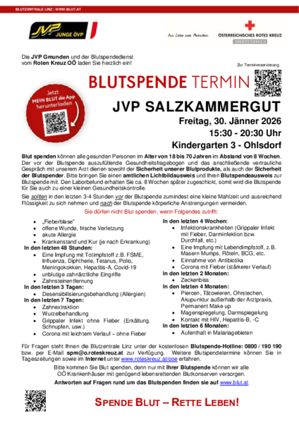 Darum hat sich unsere Jugend der JVP Salzkammergut dazu entschlossen, gemeinsame mit dem Roten Kreuz den nächsten Blutspendetermin in Ohlsdorf zu organisieren.